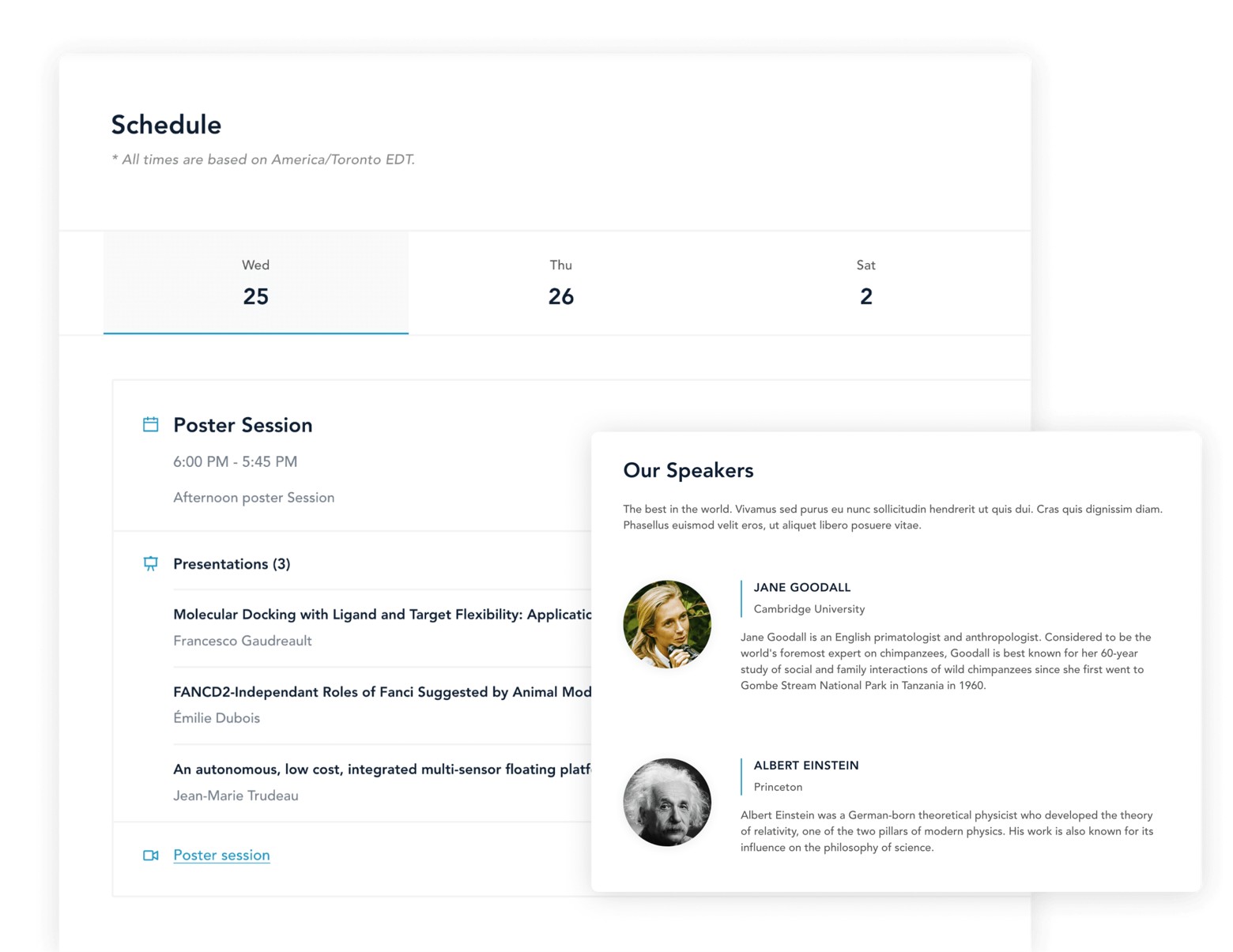 With Fourwaves you have access to a customizable event website with every plan. You can use it to showcase your conference details, its speakers, a detailed schedule, venue information and more. It’s also where your participants can register and submit their abstracts through customizable forms. The event website is very easy-to-use for conference organizers as well as for participants.