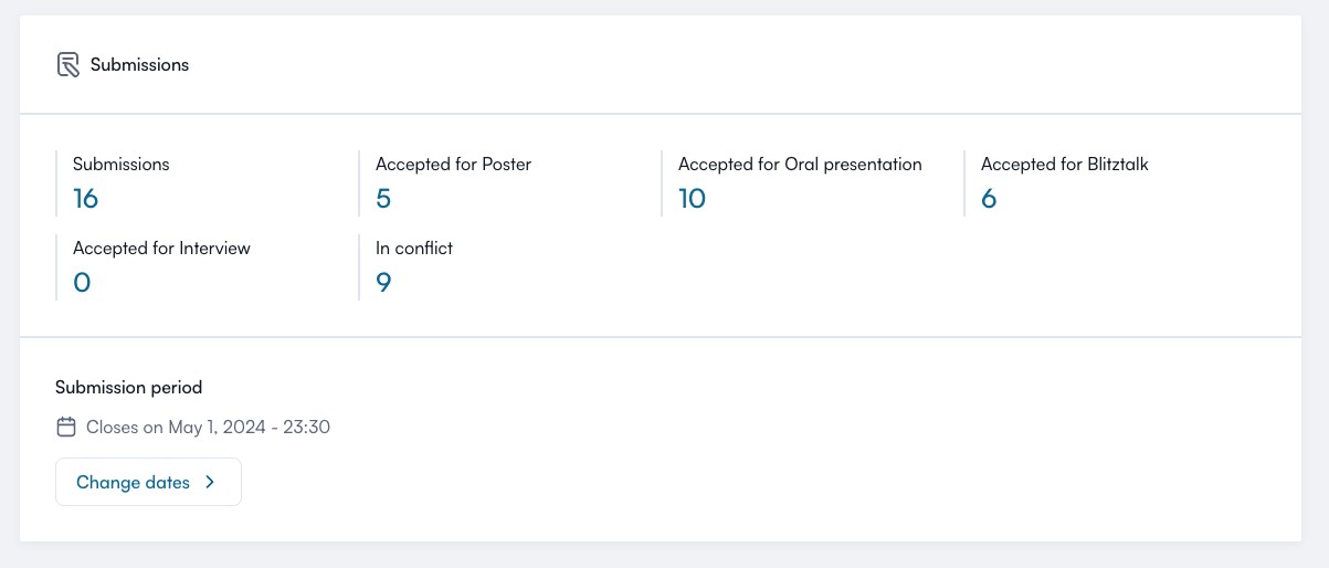 The platform provides organizers with valuable insights through their dashboard. This data helps improve future conferences and track attendee engagement. You can track your number of participants, abstracts status, payments ($), emails sent, and much more.